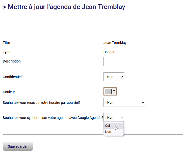 Notez que seuls les agendas des usagers ont accès à la synchronisation avec Google.